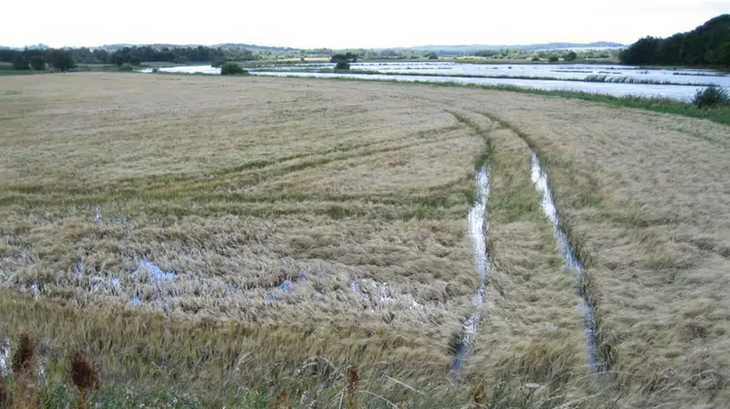 Billedetekst: Store åer som Gudenåen går jævnligt over deres bredder. Det hører til naturens orden. På billedet ovenfor ses marker og vådområder ved Åbro ud for Langå efter regnskyl i august 2010. Foto: Hanne Wind-Larsen, Randers Kommune.