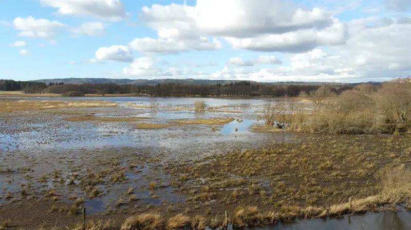 Billedtekst: Om vinteren og foråret bliver engene i Klosterkær nær Gudenåens udløb i Mossø ofte forvandlet til et stort vådområde med masser af vandfugle. Foto: Jens Muff Hansen, Naturplan.